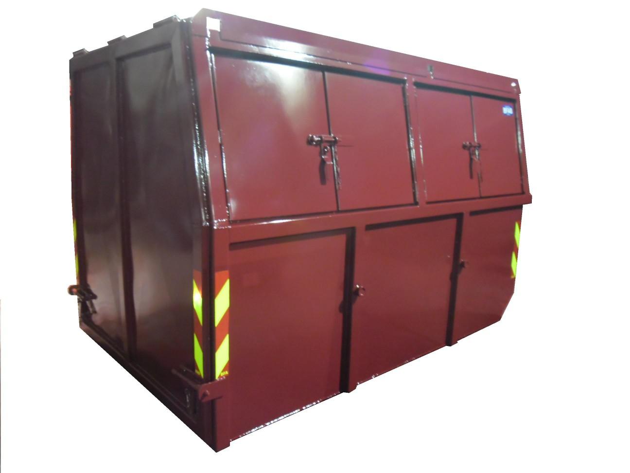 | Slēgta tipa konteiners ar 3 līdz 5mm biezām sienām. Paredzēti arī sadzīves atkritumu pārvadāšanai. Divu viedu durvis - ar eņģēm sānos vai uz augšu veramas. Krāsu izvēle pēc RAL kataloga | |